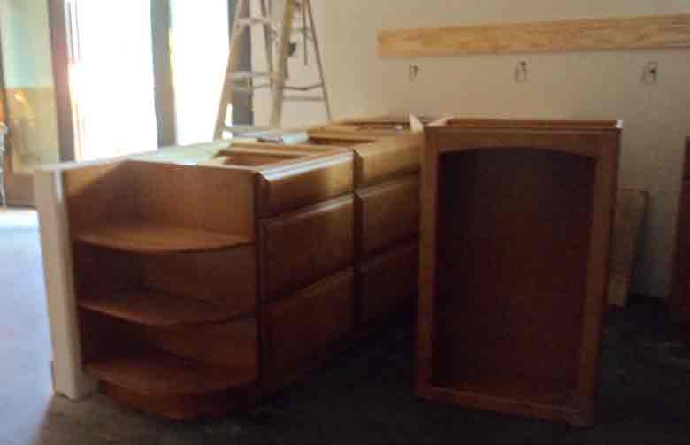 We began unpacking cabinets and attempting to place them near where they would eventually be installed.